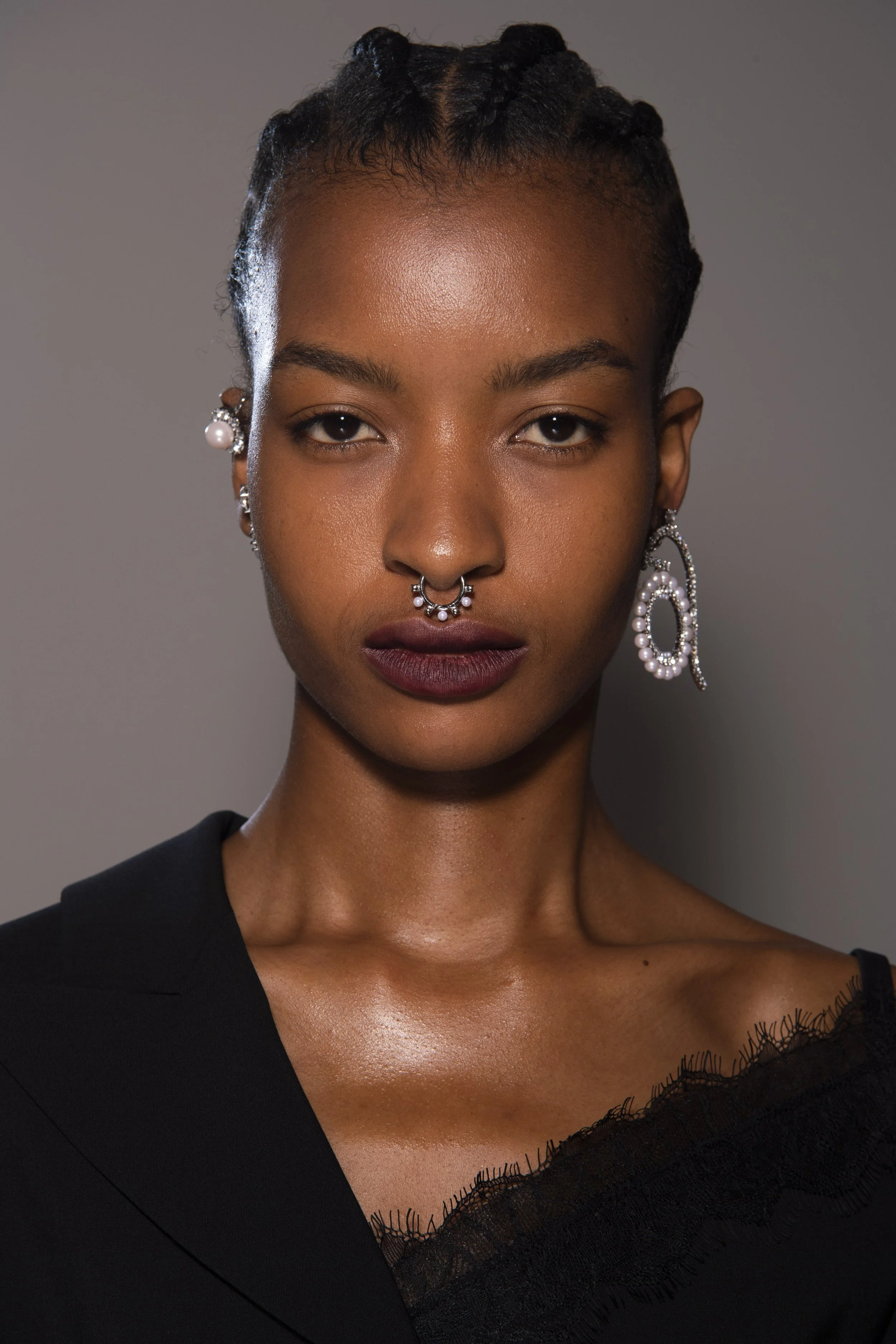 This look combines ethereal radiance with a hint of darkness. Keep the skin luminous, the brows natural, and the lips bold for a look that is both soft and striking.