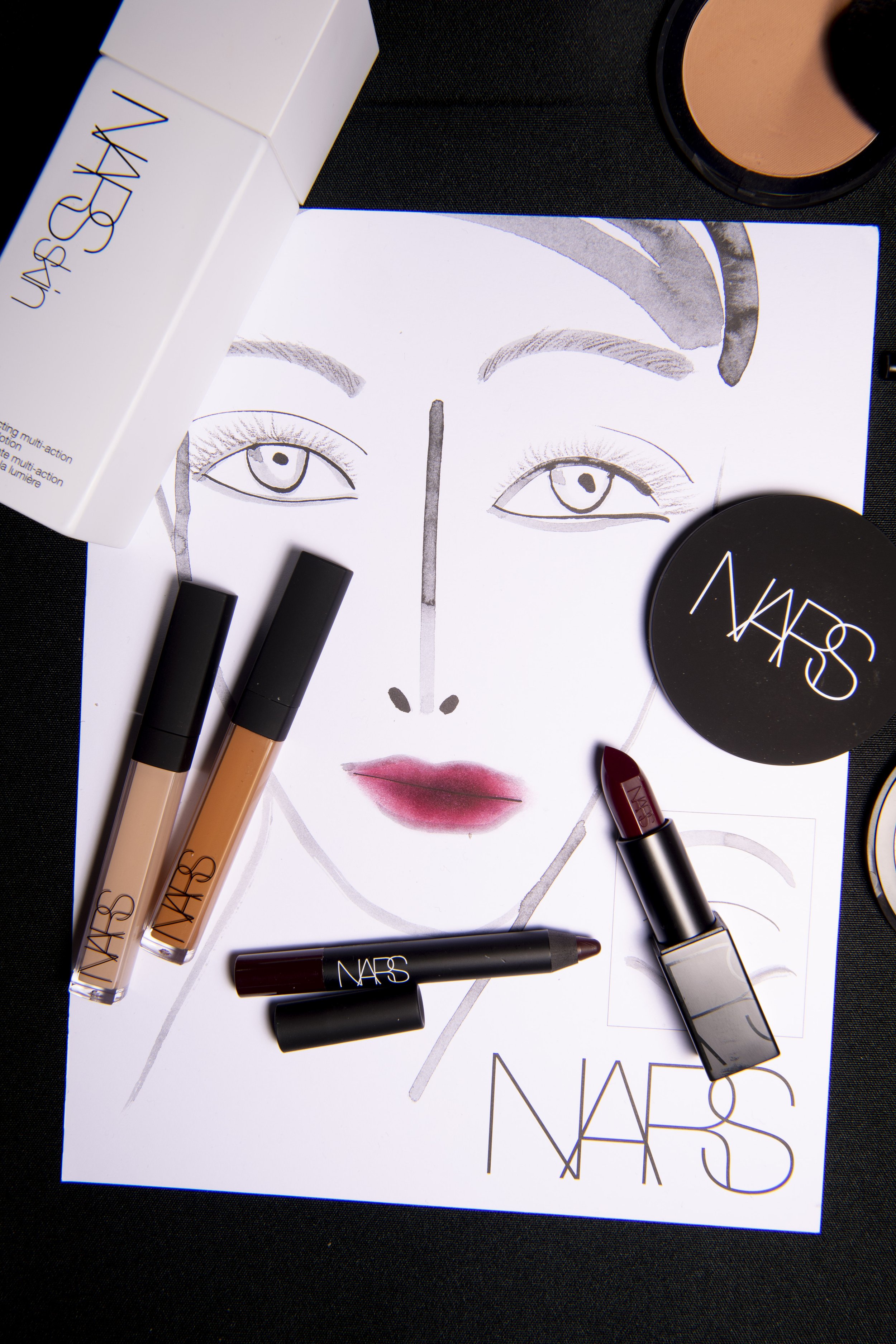 Cheeks are highlighted for a natural luminescence that complements the dark lip.